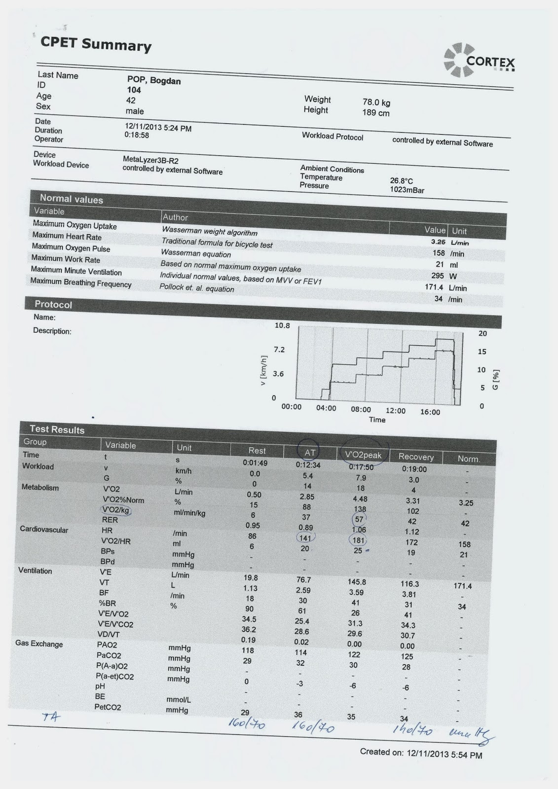 1.Masurare tensiune in repauz (mare in cazul meu, mi se intampla mereu, doar in cabinetul medicului, probabil sunt prea fricos. In continuare a evoluat ok la efort)